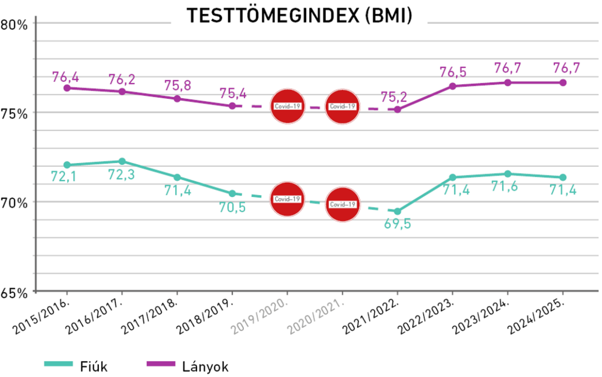 Tápláltsági adatok: a Covid–19 okozta lezárások feloldását követően a tápláltsági adatok egyértelműen pozitív irányba mozdultak, sőt, a lányoknál az utóbbi 10 év legjobb eredményeit mérték, de tavaly a lányoknál stagnálás, a fiúknál pedig sajnos romlás figyelhető meg. A pandémia előtti folyamatosan romló tendencia azonban a világjárvány óta megfordult, így összességében bíztató a kép.