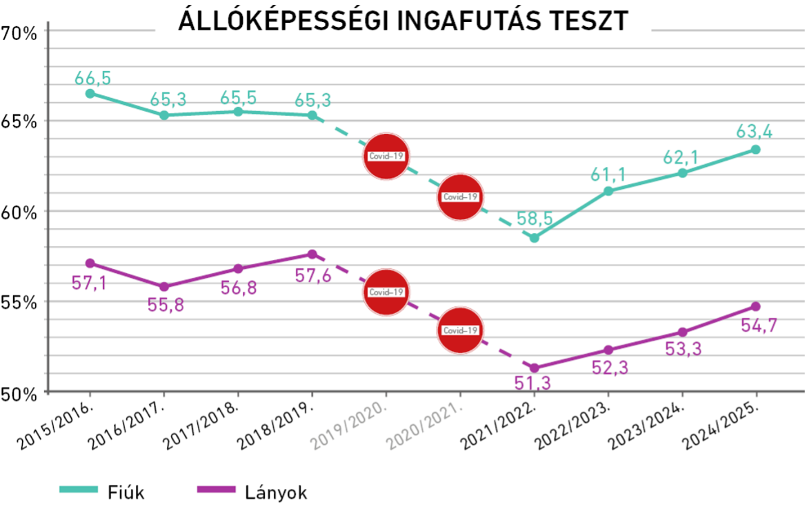 Állóképesség: sikernek tekinthető, hogy a kardiovaszkuláris fittségi állapotban a pandémia óta folyamatos a javulás: a fiúk esetében 4,9 százalékpontos a növekedés az egészségzónát elérők arányában, a lányoknál pedig 3,4 százalékpont. Itt is megfigyelhetjük a töretlenül javuló tendenciát 2022 óta, a pandémia előtti ingadozó/romló tendenciával összevetve.