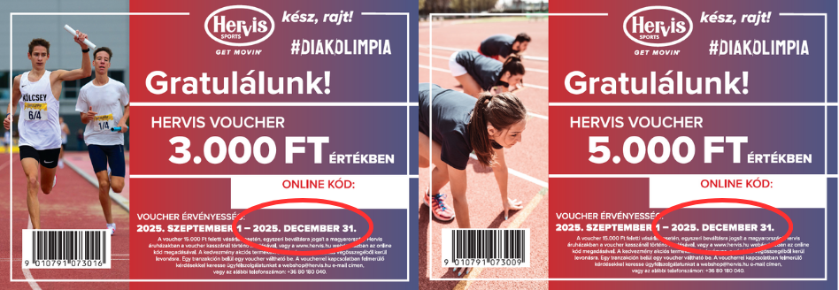 - A 2025/26. tanévi Diákolimpia® versenyekhez kapcsolódó, eddig kiosztott Hervis kuponok – a korábbi tájékoztatásnak megfelelően, változatlanul – 2025. december 31-ig használhatók fel – érdemes tehát igyekezni a kuponok beváltásával. Ezzel kapcsolatban további tájékoztatást a diakolimpia.hu oldalon találtok. ITT